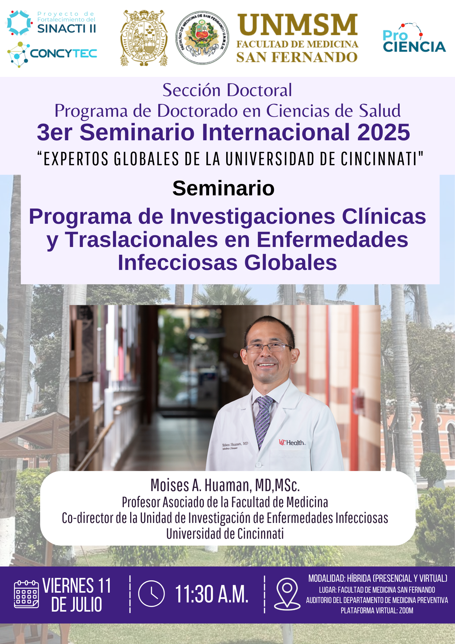 “Programa de Investigaciones Clínicas y Traslacionales en Enfermedades Infecciosas Globales”, a cargo del Dr. Moisés Huamán, Profesor Asociado de la Facultad de Medicina y Co-director de la Unidad de Investigación de Enfermedades Infecciosas de la Universidad de Cincinnati.